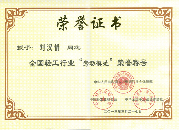 荣获天下轻工业劳动模范奖—刘汉惜
