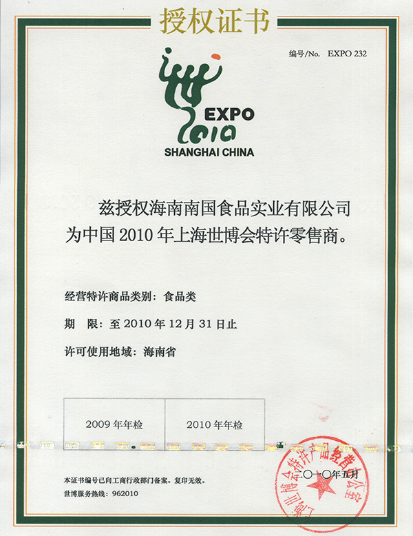 荣获中国2010年上海世博会特许零售商