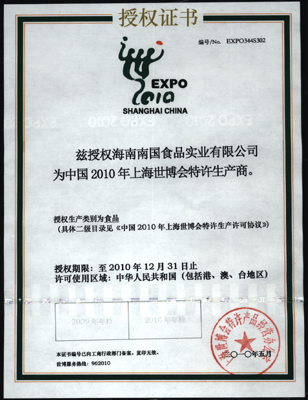 荣获中国2010年上海世博会特许生产商