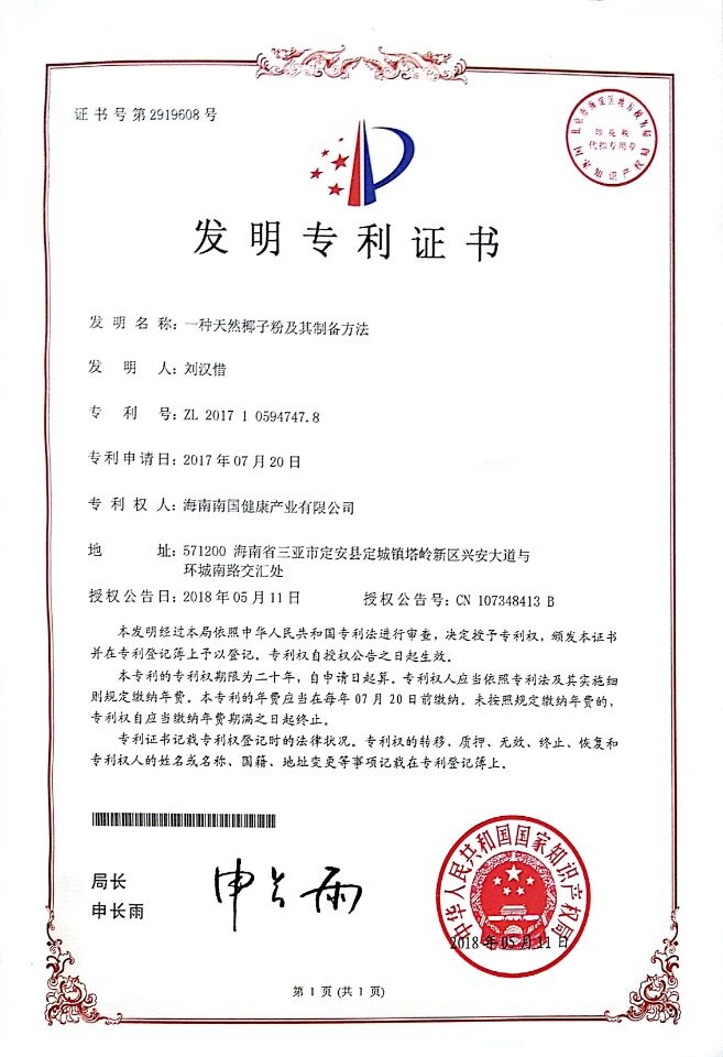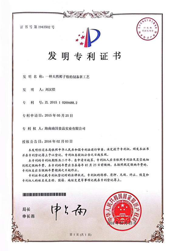 椰子营养粉的制备新工艺专利证书