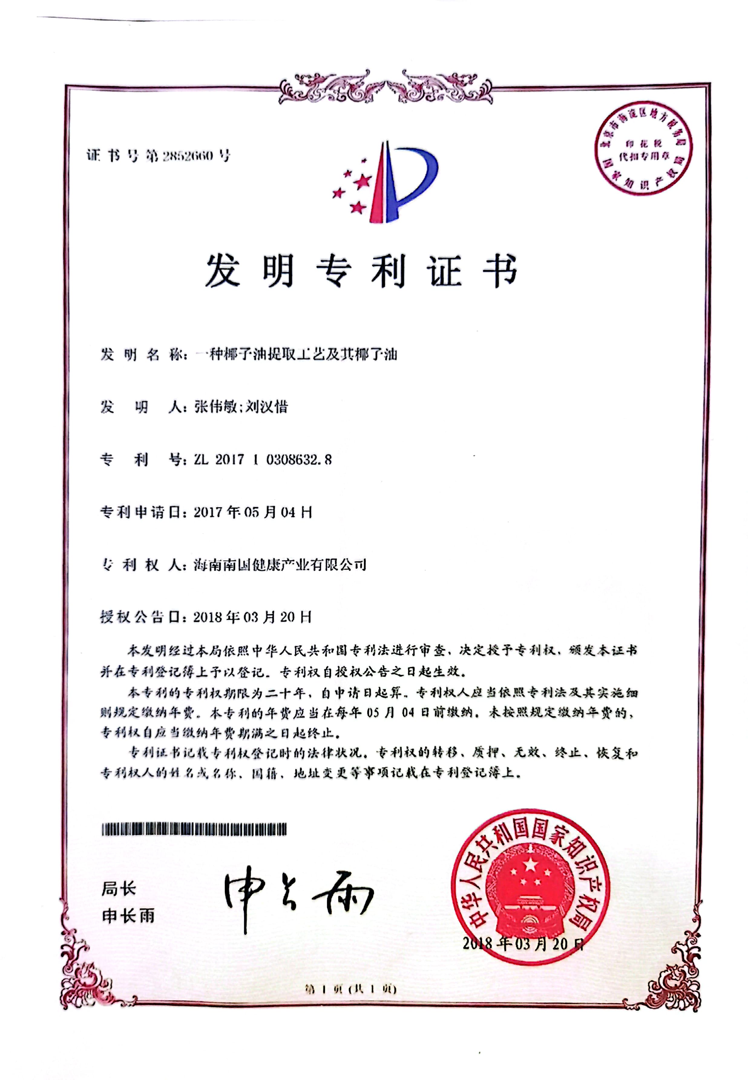 椰子油及提取工艺专利证书
