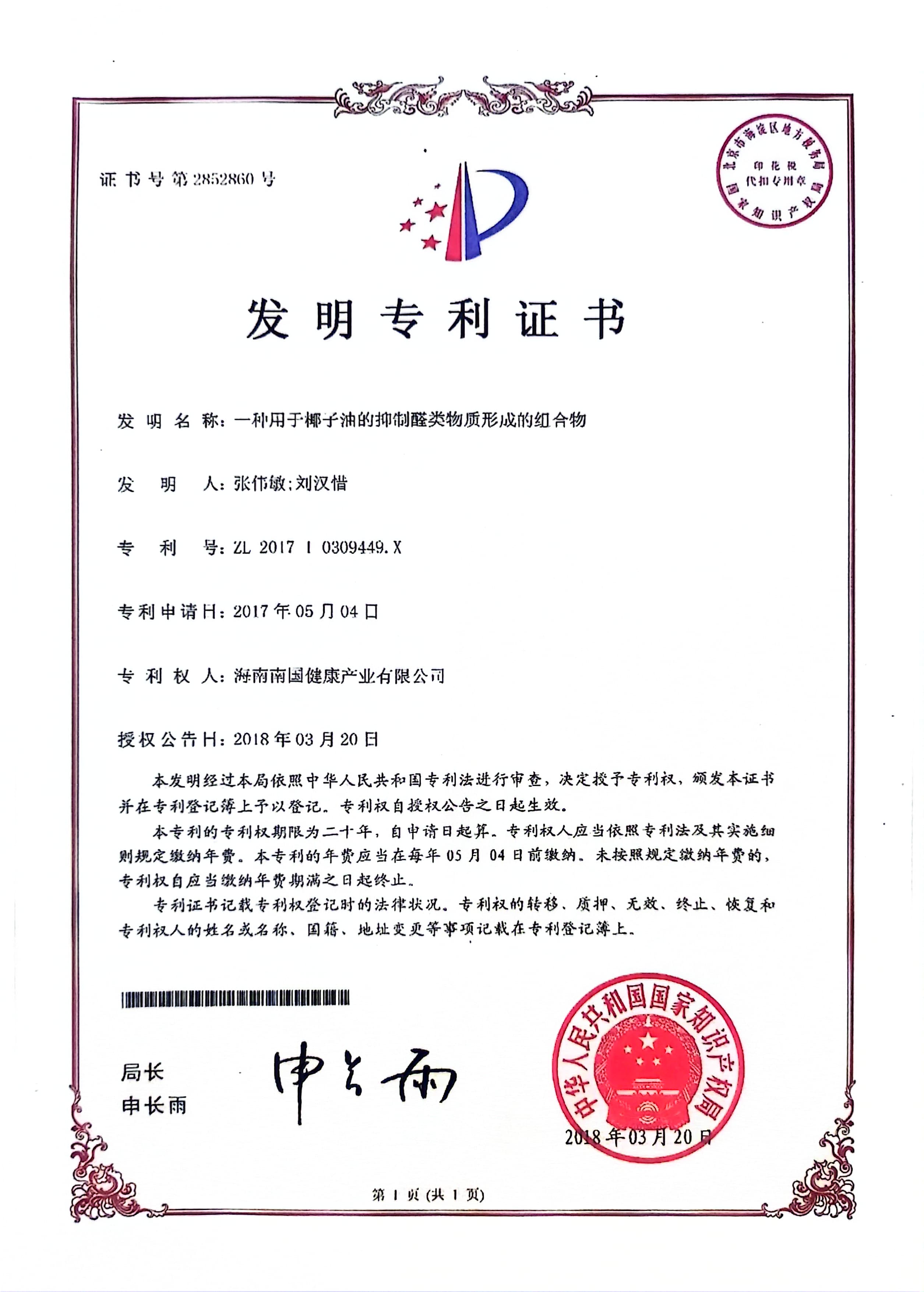 椰子油抑制醛类物质形成专利证书